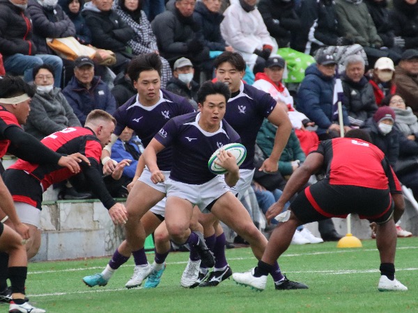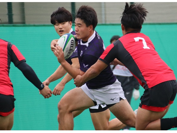 前半5分、帝京大学ボールのラインアウトをスチールし、アタックに転じるとペナルティを獲得し、このチャンスでSO伊藤利江人がペナルティゴールを決め、先制に成功します。しかし、前半14分、帝京大学からコンタクト局面でプレッシャーをかけられ、ターンオーバーを許し、自陣22m内でのラインアウトを帝京大学に与えると、ラインアウトモールを起点にトライを許し、逆転されます。