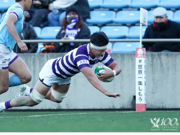 しかし、筑波大学ボールのスクラムにプレッシャーをかけ、ペナルティを獲得し、敵陣22内に侵入すると、CTB平翔太がラインブレイクしそのままトライをあげ、24-7とします。勢いに乗った明治は、後半27分にラインアウトから9フェーズアタックを重ね、CTB秋濱悠太がトライをあげると、直後の後半30分にはラックサイドを抜け出した萩原周がトライをあげ、38-7と突き放しました。そして、後半最後のプレーで、筑波大学ボールのスクラムにプレッシャーをかけ、ボールが乱れるとそのボールをFL利川桐生が抑え、トライをあげ、45-7で試合終了を迎えました。