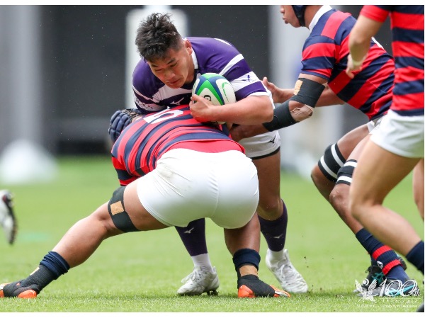 しかし、明治が2連続でペナルティを犯し、ピンチを迎えると、前半28分に京都産業大学がトライをあげ、7点差に迫られます。さらに、前半33分、38分と自陣22m内でのペナルティからペナルティゴールを決められ、1点差に迫られます。このまま前半終了を迎えるかと思われましたが、明治がペナルティを獲得し、ペナルティゴールも十分に狙える位置でしたが、強気にタッチに蹴り出し、ラインアウトのチャンスを得ると、モールを押し込み、再びHO松下潤一郎がトライをあげ、前半を26-18で折り返します。